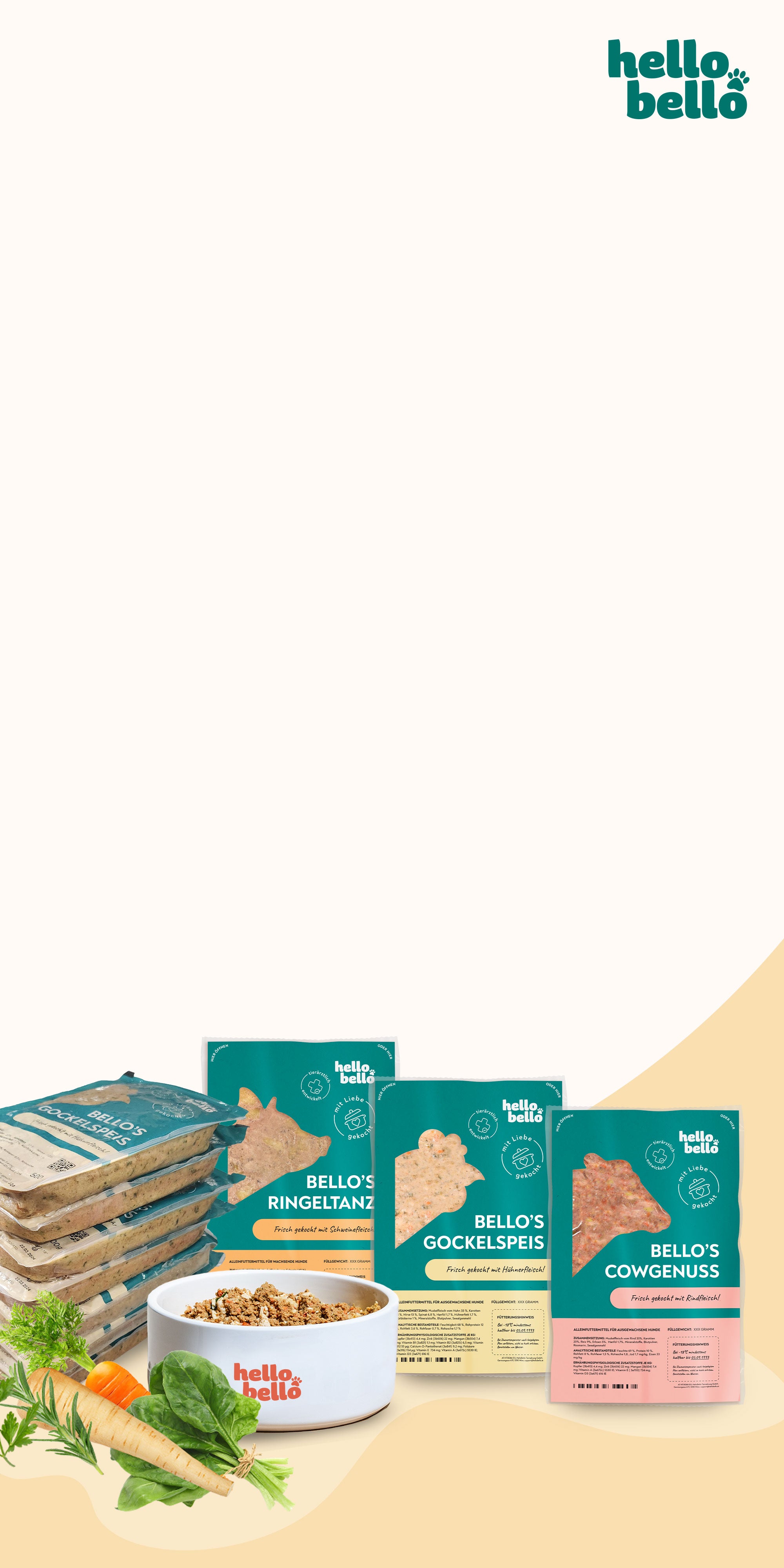 HelloBello wurde tierärztlich entwickelt und ist das erste frisch gekochte Futter für deinen Hund. Drei hochwertige Sorten, die deinen Vierbeiner mit allen Nährstoffen versorgen, die er für ein langes und gesundes Leben benötigt.