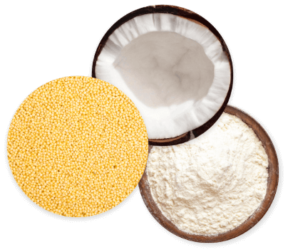 Hirse (34,44%), pflanzliches Glycerin, Kokosmehl, Kokosöl (6,89%), Mineralstoffe