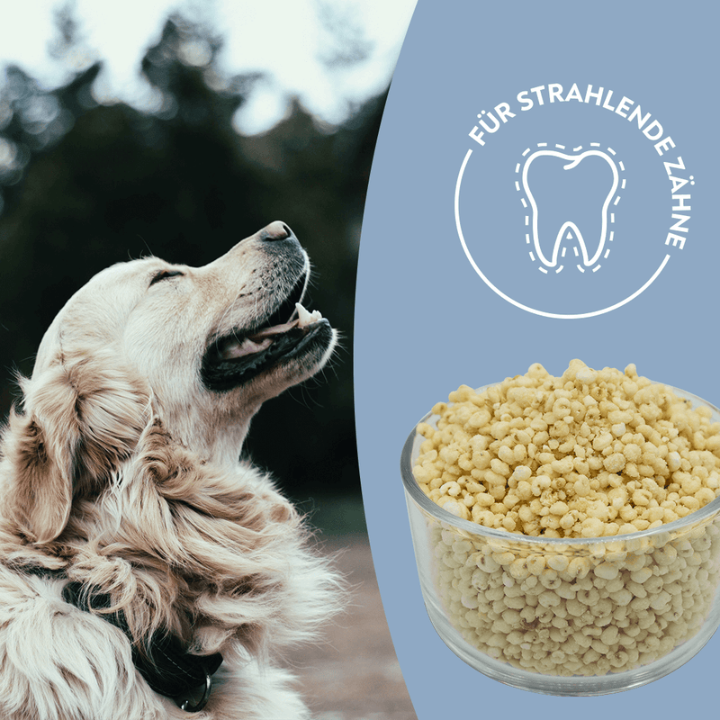Gesunde Zahnpflege kommt ganz ohne Chemie aus. Hirse und Kokosöl sind das Traum-Duo, wenn es darum geht, die Beißerchen unserer Hunde auf Hochglanz zu bringen. Und schmeckt auch noch so gut, dass dein Hund gar nicht genug bekommen wird.